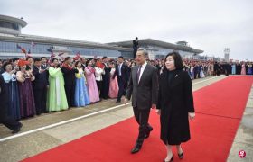 中国外交部长王毅(右二)星期四(4月9日)乘机抵达平壤国际机…