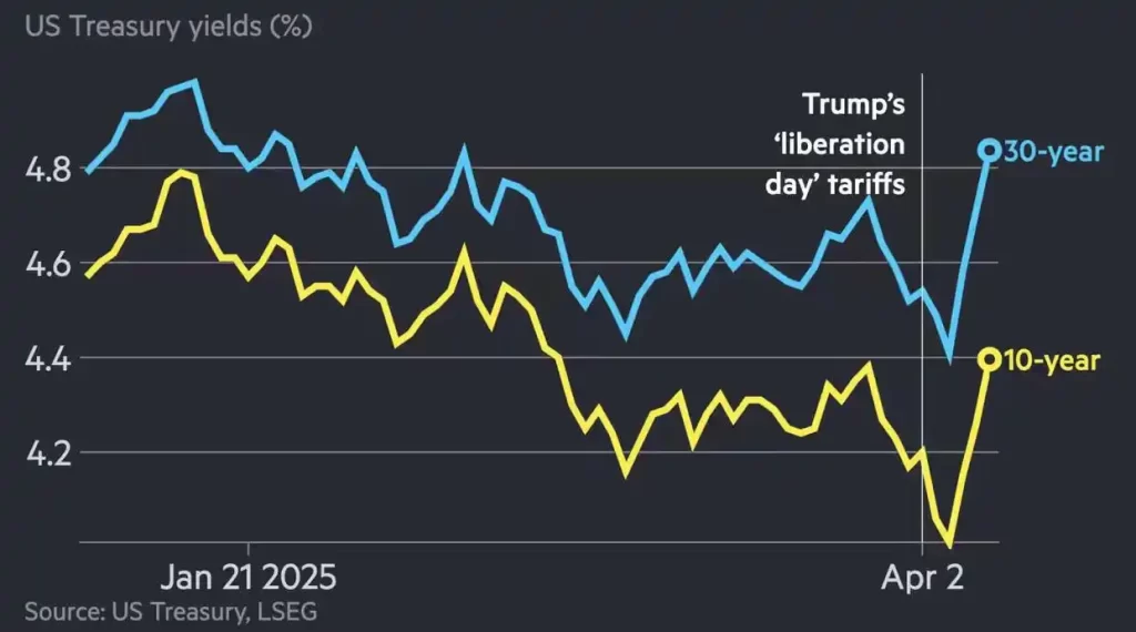 特朗普2日宣布对贸易伙伴广泛征收“对等关税”,一度推动资金转往债市,到了本周,传统上被视为避险资产的美国国债却被投资者大量抛售,导致收益率上升。据路透社9日报道,美国30年期国债收益率过去三天内飙升近60个基点,一度突破5%大关。报道说,如果这一趋势持续,将是自1981年以来最严重的一次抛售。