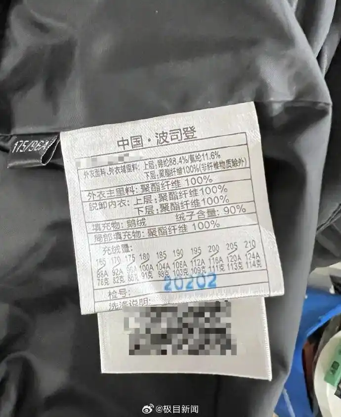 近日,有江苏网友发文称,波司登门店一款售价2099元羽绒服,充绒量只有86克,质疑品牌溢价过高。水洗标图片显示,衣服尺码为“175”,对应的充绒量为86克。