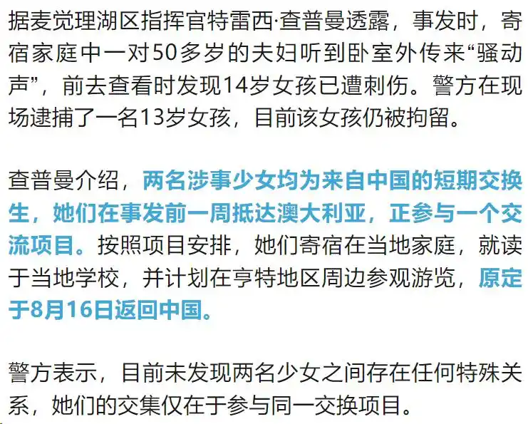 当地时间8月4日,澳大利亚新南威尔士州纽卡斯尔附近的埃奇沃思 (Edgeworth)地区发生一起持刀伤人案,一名14岁中国交换女生在寄宿家庭中遭刺伤后不幸身亡,另一名13岁的中国交换女生被警方逮捕并协助调查。