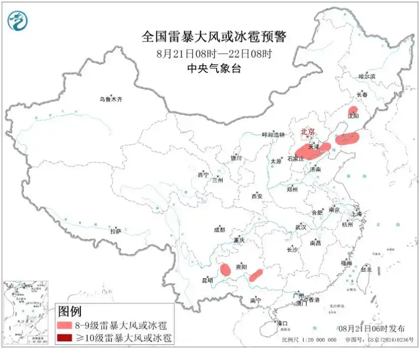 预计8月21日08时至22日08时,华北大部、内蒙古东部、东北地区中南部、西南地区东部和南部、华南西部、江南东部等地的部分地区将有小时雨量大于20毫米的短时强降水天气,其中,河北中南部和东北部、北京北部山区和东南部、天津、辽宁中北部、吉林中东部、四川盆地东南部、贵州西南部、云南东北部、广西北部等地的部分地区小时雨量大于50毫米,最大可达80毫米以上;河北中南部、山东北部、辽宁中部和南部、贵州西南部、广西北部等地的部分地区将有8级以上雷暴大风或冰雹天气。