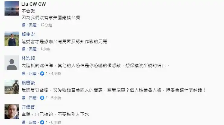有人留言“个人造孽个人担”“我们又不是沈伯洋,有什好担心的?”“别把其他2300万人和他绑在一起,其他台湾民众没有拿美国人的钱!”有人反问陆委会,“所有台湾民众都在‘台独’顽固分子清单上吗?”“把所有台湾人都说成沈伯洋,除了操作‘恐中’‘仇中’‘抗中’以外,没别的功能了!”还有人直指“陆委会才是恐吓台湾民众及认知作战的元凶”。