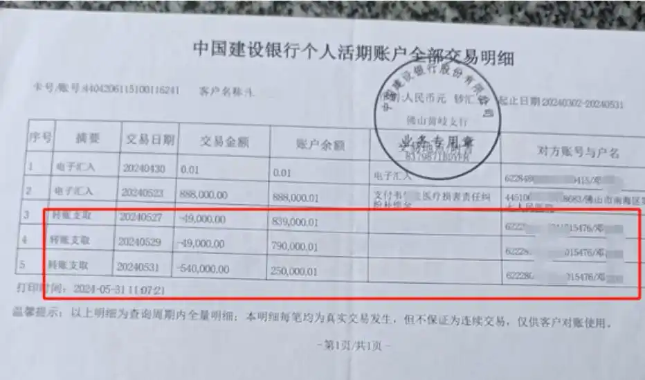 银行流水显示,5月23日南海第七医院便将88.8万元赔偿款打入了韦先生账户,5月27日、5月29日,韦先生账户将两笔4.9万元转入邓某账户;5月31日,韦先生账户将54万元转入邓某账户。