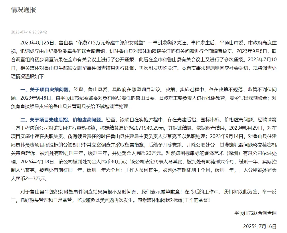 7月16日晚,平顶山市联合调查组再就“鲁山县花费715万元修建牛郎织女雕塑”一事发布情况通报,通报称,2023年9月8日,由平顶山市纪委监委对负有领导责任的鲁山县委、县政府主要负责人进行批评教育,责令写出深刻检查;对负有直接领导责任的鲁山县分管副县长给予诫勉谈话处理。2025年2月18日,与该事件相关的多人已获刑。