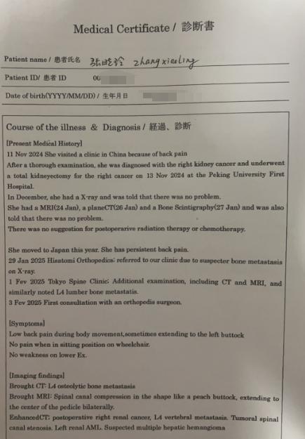 2025 年 2 月,张晓玲又到国外的医院进行了检查,被确诊为 ” 肾癌骨转移 “。张晓玲称,她此后咨询过多位专家级的医生,都告知她,她所患的肾癌和骨转移都不是一朝一夕能形成的,如果能早发现早治疗,病情肯定不会如此严重。