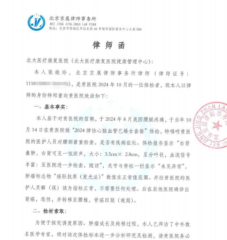 7 月 16 日,潇湘晨报记者联系到了张晓玲,其向记者讲述了自己这一段经历。目前,张晓玲已经给爱康国宾发出了律师函,并向国家卫健委寄送了举报信。她认为,爱康国宾存在漏检、误检问题,并质疑爱康国宾的体检是 ” 假体检 “。7 月 17 日上午,潇湘晨报记者拨打了爱康国宾北京总部的电话,有一名男性工作人员接听了电话。在记者表明身份,并讲述了北京律师张晓玲的遭遇和投诉后,该工作人员直接挂断了电话。