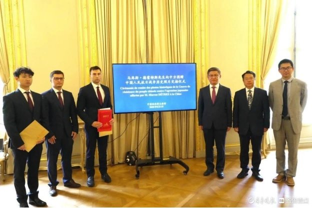 8月4日,在巴黎的中国驻法大使馆内,法国小伙马库斯·德雷特斯郑重移交了618张历史照片。这些泛黄的明胶银盐影像,大多聚焦淞沪战场,真实凝固了日军轰炸屠戮的血腥瞬间,甚至部分照片背面仍残留着血迹。马库斯与好友士杰、钟灏松一同参加,中国驻法大使馆向三人颁发了捐赠证书、感谢信,并赠送了存储所有历史照片电子版的青花瓷U盘,希望他们一起向全世界讲述这段难忘的历史。