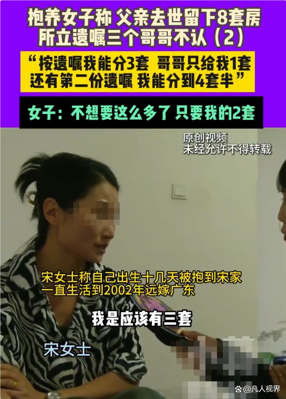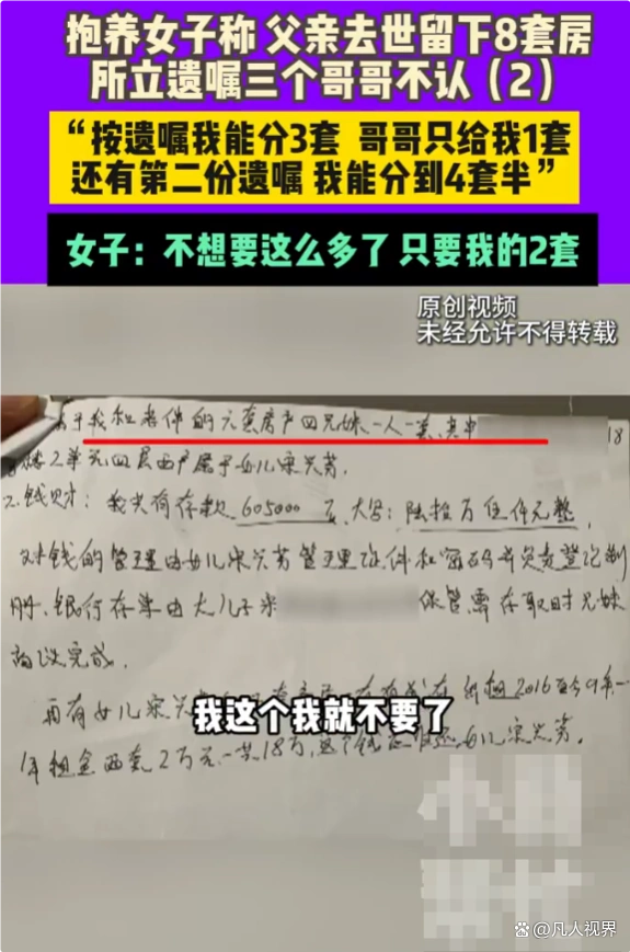 故事的主角是一位八旬老人,他一生积攒下8套房产和100万存款。在他离世后,这份看似丰厚的遗产却成了家庭矛盾的导火索。老人的非亲生小女儿拿出遗嘱和生前录制的视频,声称父亲要将其中3套房产留给自己。不仅如此,她还透露存在一份补充遗嘱,若哥哥们不同意3套房的分配方案,她将获得4套半房产。而3个哥哥对这份遗嘱的真实性和小妹的动机提出了强烈质疑,双方矛盾一触即发。