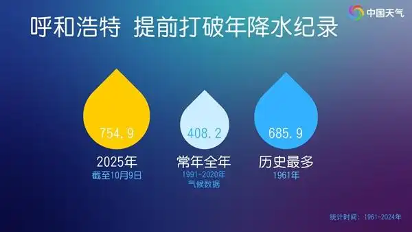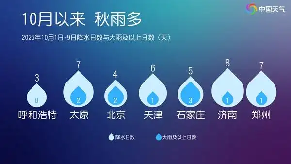 中国天气网统计1991年至2020年大数据发现,常年10月,呼和浩特、太原、北京、石家庄、济南等城市降雨日数在5天左右,大雨及以上日数仅0.1天或0.2天,今年上述地区大雨及以上日数均超过当地常年10月全月。此外,截至10月9日,呼和浩特今年以来累计雨量也都提前打破当地全年累计雨量纪录。