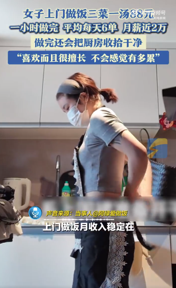 5月7日(采访),浙江杭州,女子从事上门做饭的工作,三菜一汤收费88元,平均每天能接6单,月薪近2万。