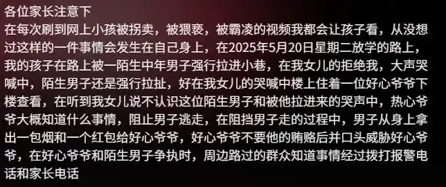 近日,湖南娄底。赵女士称,6岁的女儿放学途中,被一陌生男子拉入巷子中。