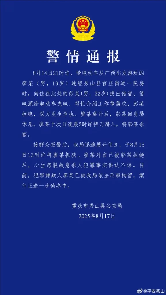 17日晚11时,@平安秀山 发布警情通报:8月14日21时许,骑电动车从广西出发游玩的廖某(男,19岁)途经秀山县官庄街道一民房时,向住在此处的彭某(男,32岁)提出借宿、借电源给电动车充电、帮忙介绍工作等需求,彭某拒绝,双方发生争执。廖某离开后,彭某回房屋休息。廖某于次日凌晨2时许持刀潜入,将彭某杀害。