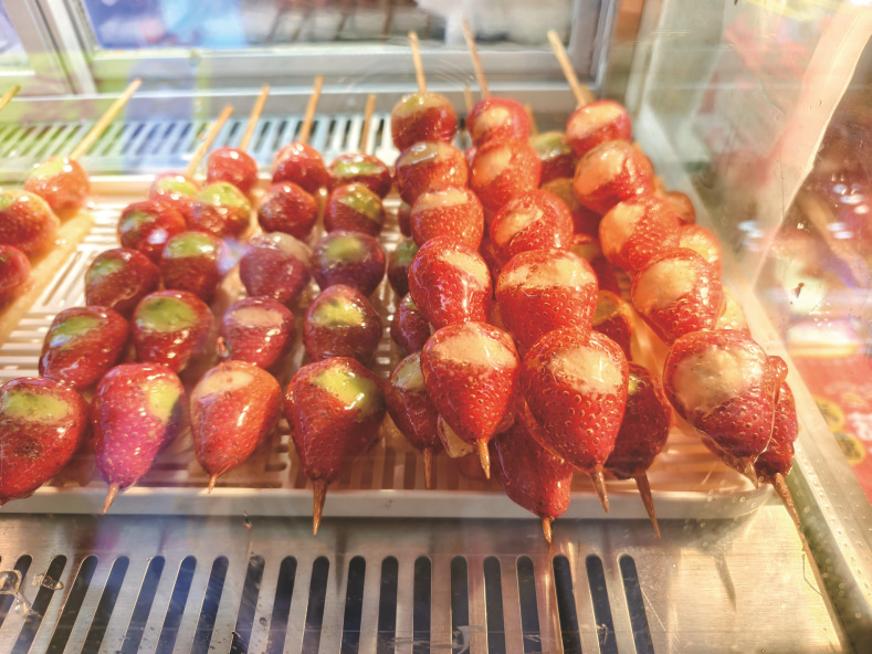 奶皮子糖葫芦作为初冬的爆款,其创新之处在于将内蒙古非遗奶皮子与高阶水果巧妙结合。奶皮子,这一由8斤鲜奶熬制出的1斤乳脂层,包裹着晴王葡萄、草莓等水果,再裹上一层脆糖衣,形成了“脆糖壳+绵密奶皮+果酸爆汁”的三重口感。