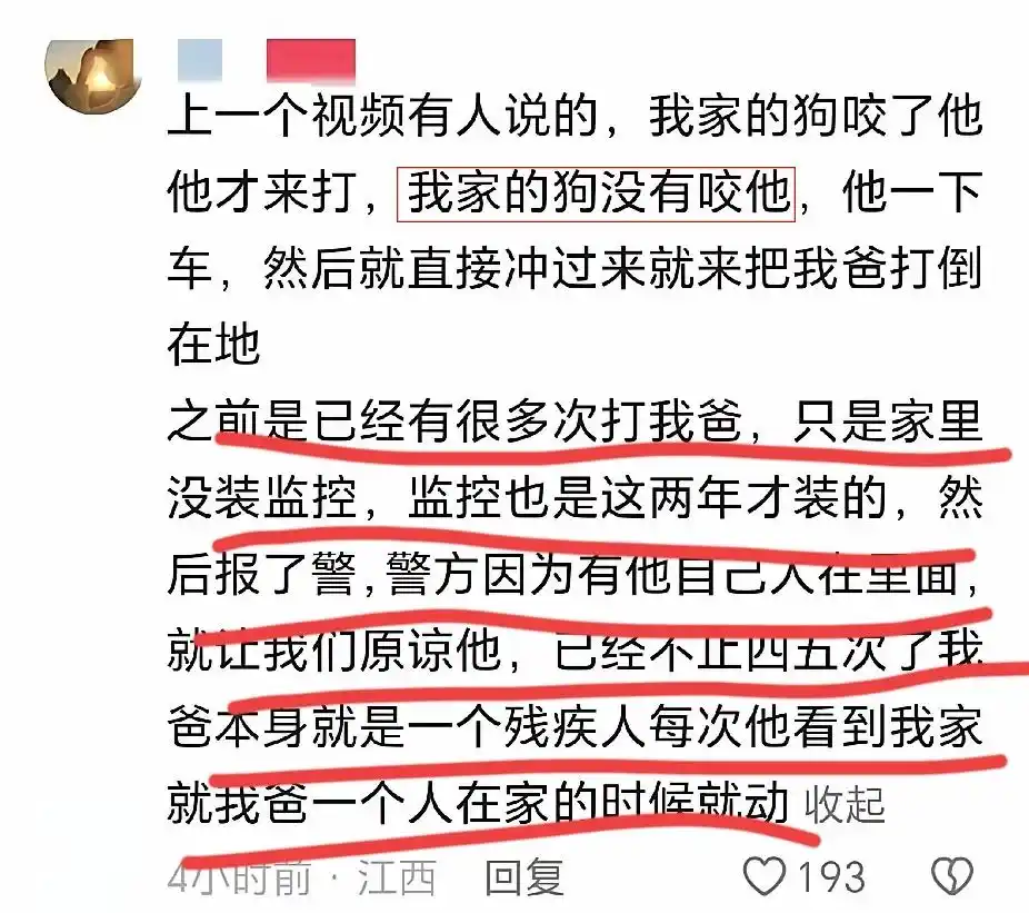 她说有人猜测是自家的狗咬了黑衣壮汉,对方才会打她的爸爸,事实却是她家的狗没有咬人,黑衣壮汉是一下车就直奔过来,还没说上两句话就动手打人的,可见目的非常明确,事先也毫无征兆。