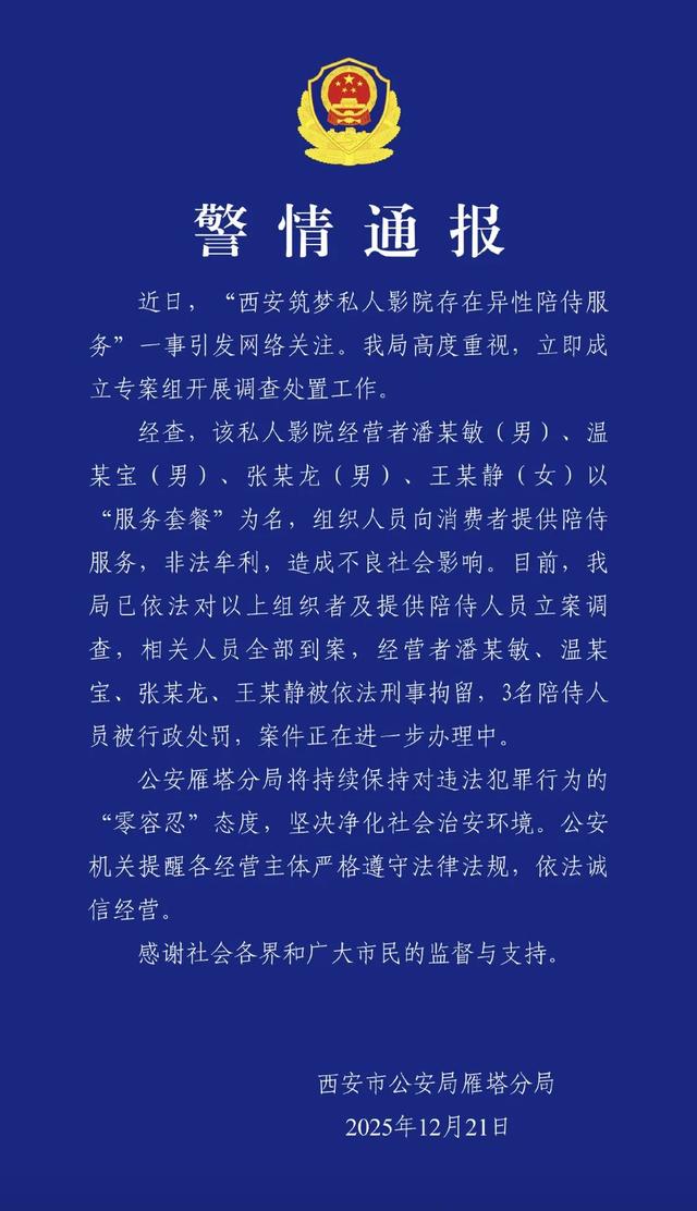 目前,西安市公安局雁塔分局已依法对以上组织者及提供陪侍人员立案调查,相关人员全部到案,经营者潘某敏、温某宝、张某龙、王某静被依法刑事拘留,3名陪侍人员被行政处罚,案件正在进一步办理中。西安一私人影院提供陪侍服务,4名经营者被刑拘,3名陪侍人员被行政处罚