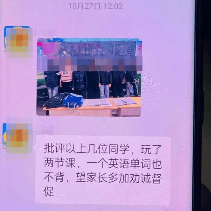 英语老师要求小川和其他6名同学一起罚站,并将罚站的照片发到了家长群里,希望家长多加监督。