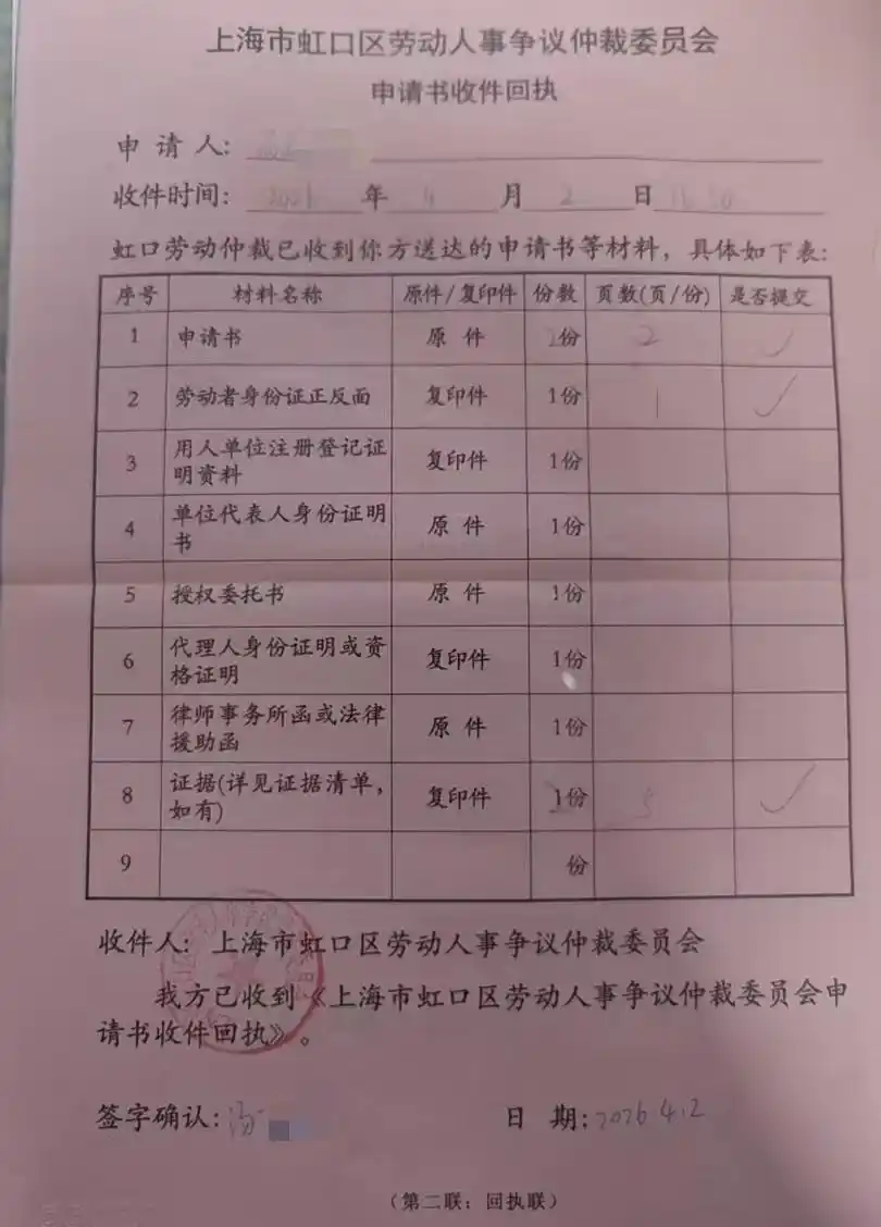 汤女士告诉红星新闻记者,4月2日,她前往上海市虹口区劳动保障监察大队提交了《人社监察执法调解仲裁综合申请表》,要求上海酷皇科技有限公司支付终止劳动合同的经济补偿金。