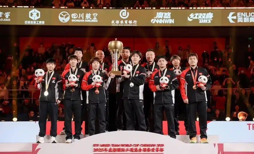 当林诗栋以一记凌厉的进攻锁定胜局,四川省体育馆瞬间被炽烈的中国红淹没。 记分牌定格在8比1,中国队以一场压倒性胜利击败老对手日本队,将第三届混合团体世界杯的冠军奖杯,“刘国梁-索林杯”高高举起。 这是中国乒乓球队在本次赛事中的第十一场连胜,也是他们在该项赛事上的三连冠。