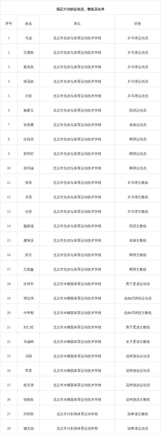 该公示显示:“在第十五届全国运动会,北京体育健儿顽强拼搏、团结协作,圆满完成参赛任务,为首都体育事业再创佳绩。依据《北京市事业单位工作人员奖励实施办法》等文件规定,市人力资源社会保障局会同市体育局对在第十五届全国运动会上作出杰出贡献的北京运动员和教练员,开展记大功奖励工作。根据奖励工作部署,在有关单位积极推荐的基础上,经综合评审、统筹考虑,确定北京乒乓球运动队等9个集体,马龙等28位同志拟记大功对象。”