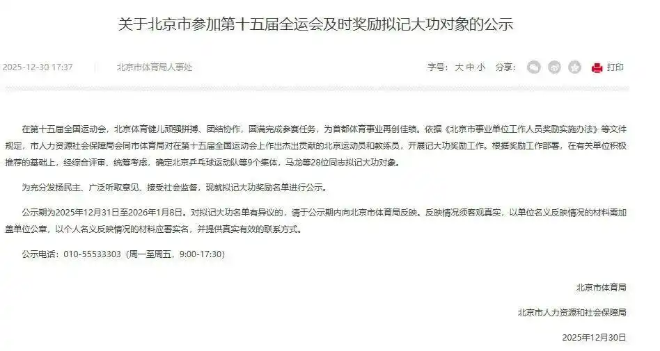 北京市体育局官网在12月30日发布《关于北京市参加第十五届全运会及时奖励拟记大功对象的公示》,拟对北京乒乓球运动队等运动队集体以及马龙等运动员、教练员记大功。