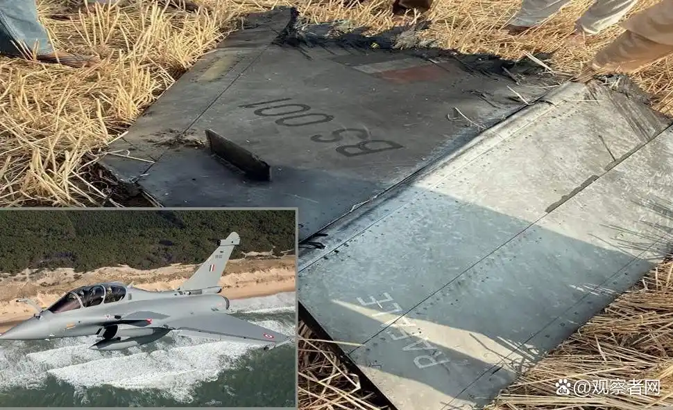 印军接收的首架编号为BS001的“阵风”战机,以及社交媒体流传的疑似该机垂尾残骸。 社交媒体