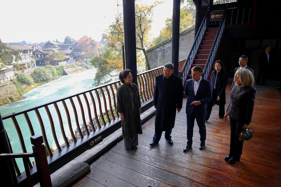 法国总统马克龙(右二)及夫人布丽吉特(右一)在中国国家主席习近平(左二)及夫人彭丽媛在(左一)的陪同下,在四川参观联合国教科文组织世界遗产都江堰。(路透社)